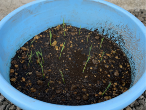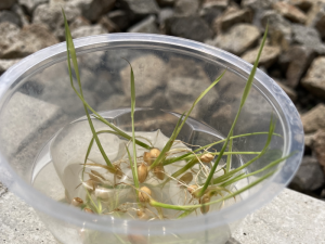 5月22日(月)~6月30日(金)の期間、自宅で種もみを水に浸けて発芽に挑戦しました。室温や日照時間の違いで生育に差があり、芽が出たばかりのものから新芽をバケツに植えかえるところまで進んだ参加者もいました。