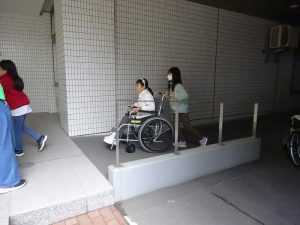 また、実際に車いすを使って、スロープでの押し方や、自動販売機での購入などを体験しました。