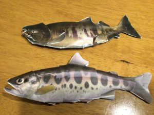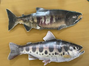 第3回は7月20日(土)~8月7日(日)に自宅で動画を見ながら、サケとヤマメのペーパークラフト制作に取り組みました。 参加したみなさんからは、 「三角に切るところが難しく手伝ってもらった。可愛い魚ができて満足した」 「作るのが大変でしたが、楽しかったです」 などの感想がありました。 また全3回を通して保護者さまからは、 「イベントから帰ってきて、川の中で見つけた生き物の話なども聞かせてもらい、参加して良い体験が出来て良かったです」 「水中メガネを作る段階から気持ちがワクワクしており、魚のペーパークラフトは苦戦しながらも完成する事ができました。またこのような機会があれば、ぜひ参加したいです」 という感想が寄せられました。 水辺に住む生き物や川が持つ役割と、私たちの生活との関わりについて関心を深めることができたようです。