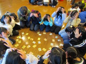 12月14日(土)~15日(日)に札幌市青少年山の家で一泊二日の宿泊研修を実施しました。 今回は、中央区・厚別区・清田区・西区・手稲区からバスに乗った研修生約200名が集まり、学校や学年のちがうメンバーとグループを作って活動しました。 二本の縄を跳ぶなわとび『ダブルダッチ』のインストラクターのパフォーマンスを見学し、上手に跳ぶコツを教わってから挑戦し、グループの結束を深めました。初めて聞く言葉も多かった『北海道弁かるた』で白熱し、夜は屋内キャンプファイヤーの歌やダンスで大いに盛り上がりました。 参加した研修生からは、「ダブルダッチはできないと思っていたけど、思ったよりできて、何でもやってみることが大切だとわかった」 「ふだんこういう経験はあまりしないので、新鮮で、今回の宿泊研修会、とっても楽しかったです!」 「みんなでそうじをすると、いつもきらいなそうじも楽しくできたので、来年もまた来たくなりました。」 「来年は中学生だから、積極的にチームをまとめたり、キャンプファイヤーのまきを入れる係に挑戦してみたい。」 「今まではレクに参加して楽しむだけだったけれど、今回は企画会議にも参加して、スムーズな進行のために上級生は緻密な計画や練習をしていることがわかったので、いつか自分でもいろいろなことに気を配って行動できるようになりたいです。」などの感想が寄せられました。