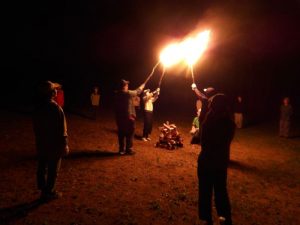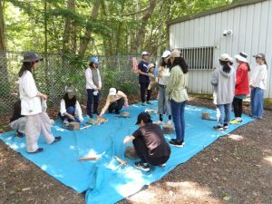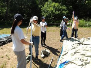 この研修は1年に一度、中級研修生が上級研修会に参加し、1泊2日共に過ごしながら、野外活動を行う宿泊研修で、おたる自然の村の二杉寿志さんを講師に招き、テント設営やまき割り、野外炊事、キャンプファイヤーなどを実践し、さまざまなアドバイスをいただきました。