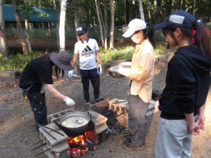 教育キャンプ用の大型テントの設営や、野外炊事でのカレーライスづくりなどの実践では、初めて経験する研修生もいる中で、上級研修生がファシリテートしながら協同して取り組み、それぞれに新たな学びを得る機会となっていた様子がうかがえました。