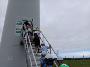 第2回目は、8月30日(土)に石狩湾新港風力発電所へ行き、風車の支柱内を見学し発電の仕組みや風車の構造を学びました。