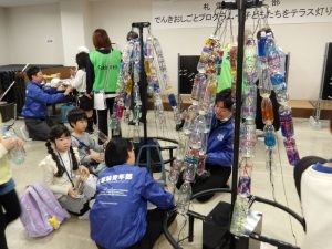 また、自宅で色付けしたペットボトルを持ち寄り、札電協青年部の皆さんと一緒に、ペットボトルの中に電飾を通してイルミネーションツリーを作りました。