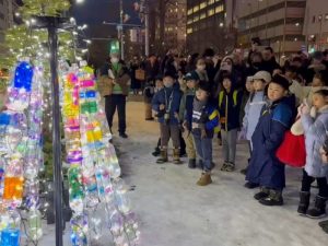 札幌電気工事業協同組合青年部主催のイルミネーション事業「でんきおしごとプログラム~子どもたちをテラス灯り~」の点灯式の中でお披露目され、子ども達の元気なカウントダウンでペットボトルツリーに明かりが灯された瞬間、見ていた人たちからは歓声があがり、温かな光が子どもたちの笑顔を照らしました。